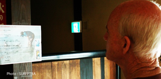 上映会は言うまでもなく、大盛り上がり。開場と同時に大勢のサーファーたちが押しかけ、2階の畳の大広間はもちろん、3階の“青爺BAR”も詰めかけた大勢の人達で埋めつくされていく。 上映会は、石井さん、青山氏、Dickさんの座談会で始まった。3人のレジェンドは拍手喝采でステージに迎え入れられると、聴衆は映画の裏話や、石井さん、青山氏の波乗りに対する姿勢を真剣なまなざしで傾聴している。かと思えば、ギャグが飛び交い、会場は一瞬のうちに大爆笑の渦の中に巻き込まれていく。