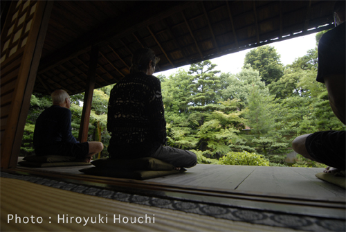 昨夜、大盛況のうちに上映会が終わり、僕たちが最後に会場を出ると同時に、まるで何かがせき止めていたかのような土砂降りの雨が降り出した。それはただの偶然とは思えないタイミングだった。天もがこの25年振りの三人の邂逅を味方してくれていたのだろう。ツアー最終日の今日は、今回のツアーで本当に楽しみにしていたことの一つ、お寺での座禅会がある。朝起きると、昨夜の土砂降りの雨は小雨になり、そのかわり蒸し暑さがジトジトと襲ってくる。でもまたその何もしていなくても、ただじっとしているだけでじわっと汗をかいてくる感じが、いかにも夏らしくて気持ちがいい。