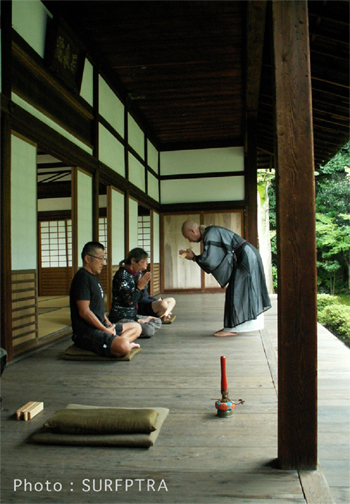 和尚さまは「坐禅は自然と一枚岩になることです。」と仰った。そしてサーフィンのことを「波と一緒に花が咲く。波と握手して一体となる。」と続けられた。石井さんが和尚さまとの話の中で、道元禅師が書いた正法眼蔵の中に、「坐禅は一生にあらず。二生三生なり。」という言葉があり、それに出会った時に私自身すごく感銘を受けた。この先10年、20年サーフィンをやっても、一生ではサーフィンというものを究めつくすことはできないだろうと思う。そのときに「二生三生なり」ということば聞いて、坐禅というものを、波乗りに置き換えて考えてみれば、波乗りも二生三生やらなければいけないと、私自身結びついてきた。そこで、坐禅の精神とサーフィンの精神というものは、自然と一枚になるという意味で同じと考えてよろしいでしょうか。と問うと、和尚さまは「もちろん、よろしいと思いますよ。天地一枚にならなければ、あの波乗りはできないと思いますよ。」と優しい声で答えられた。 - 8 - |